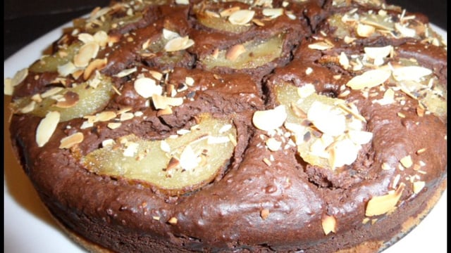 Mélanger la moitié des poires dans l'appareil à chocolat et verser dans le moule. Déposer sur le dessus du gâteau l'autre moitié des poires, Parsemer de quelques amandes effilées. Enfourner pour 40 à 50 min. La lame doit ressortir sèche