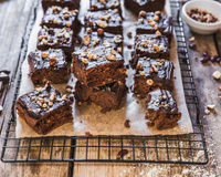 Faites fondre le chocolat à feu très doux (ou au bain marie). Une fois le chocolat fondu, étalez-le sur toute la surface du gâteau en le lissant avec une spatule. Parsemez de noix et noisettes concassées. Placez au frais. Une fois que l’ensemble a totalement refroidi vous pouvez démouler le gâteau et le couper en petits carrés.