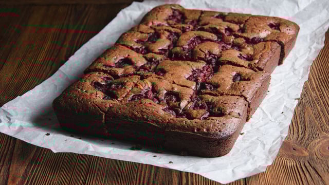 - 4Verser dans un moule carré ou rectangulaire de 20 sur 20 cm beurré et fariné. Disposer les framboises sur le dessus en les enfonçant légèrement.