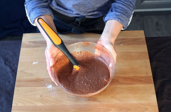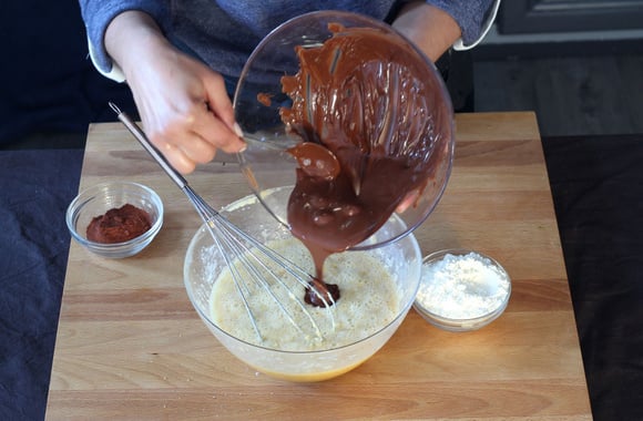 3Ajoutez le chocolat fondu et tiédi et mélangez.