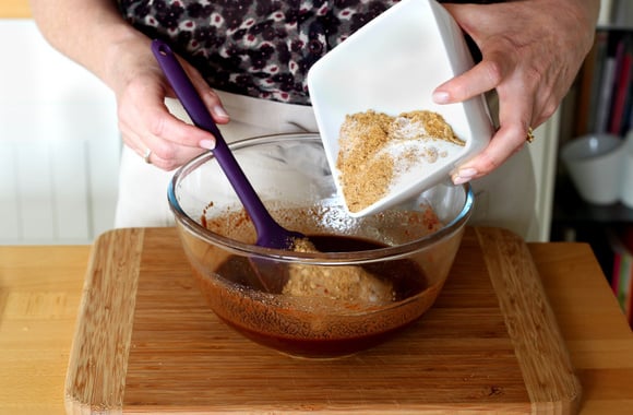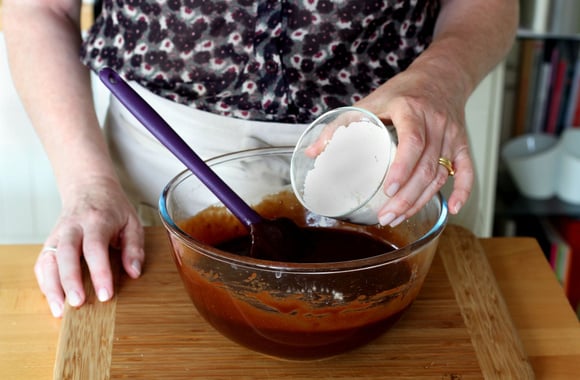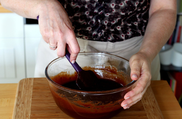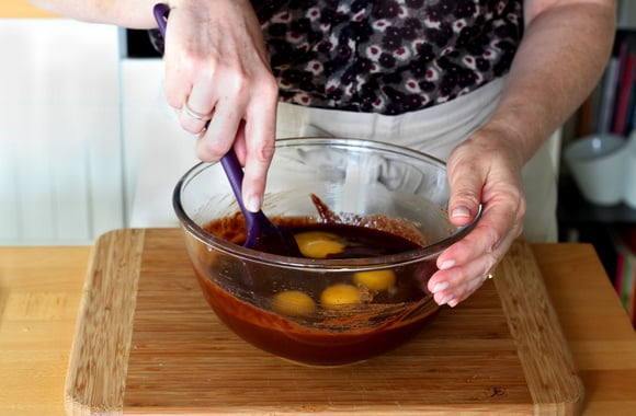 2Hors du feu, lissez le mélange chocolat et beurre. Ajoutez les sucres et mélangez bien.