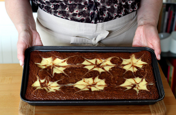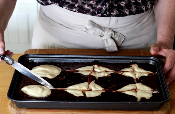 10Donnez 4 coups de couteau légers en partant du centre de chaque cercle de pâte à cheesecake afin de créer un effet marbré sur le dessus du brownie.
