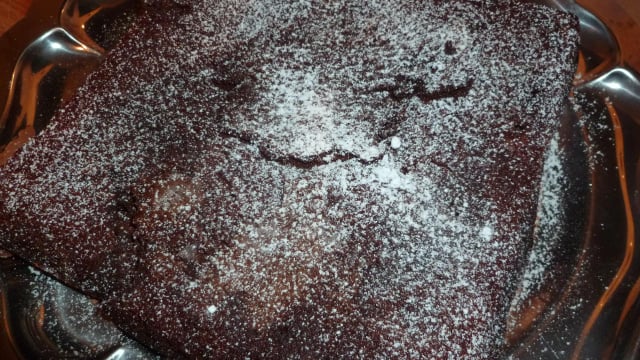 Une fois qu'il a refroidi, passer au tamis une cuillère à soupe de sucre glace et saupoudrer sur le brownie.