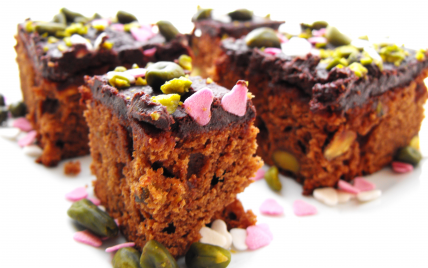Pour le glaçage, je fais chauffer la crème fraîche dans une casserole jusqu'à ébullition, puis je la verse sur le chocolat en morceaux dans un saladier. Je remue jusqu'à ce que la préparation soit lisse. Je laisse refroidir puis étale cette ganache sur le gâteau refroidit et démoulé sur le plat de service. Un peu de déco avec les pistaches réservées et des coeurs en sucre, et voilà, un joli gâteau pour enchanter vos goûters !