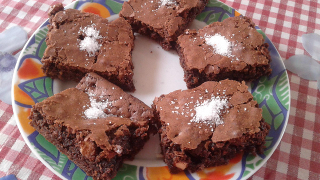 Ajouter la farine et le cacao et bien mélanger. Faire cuire dans un four préchauffé à 180°C environ 40 min. Découper en carreaux et décorer leur centre de sucre glace.servir froid.