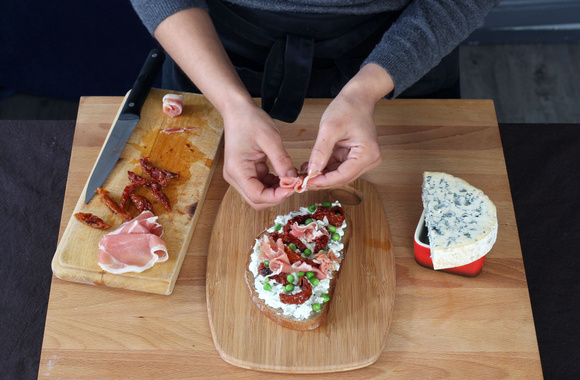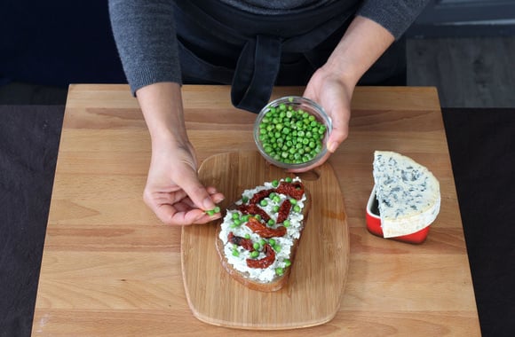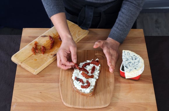 5Tartinez les tranches de pain grillé avec le mélannge à la fourme. Décorez avec des lamelles de tomates sechées.