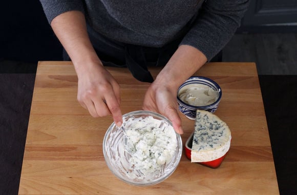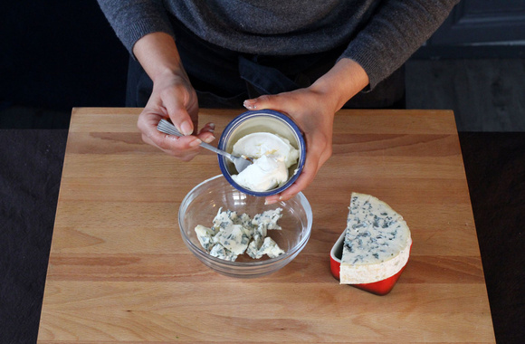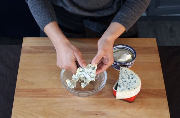 2Coupez la fourme d'Ambert en petits dés, versez-les dans un bol.