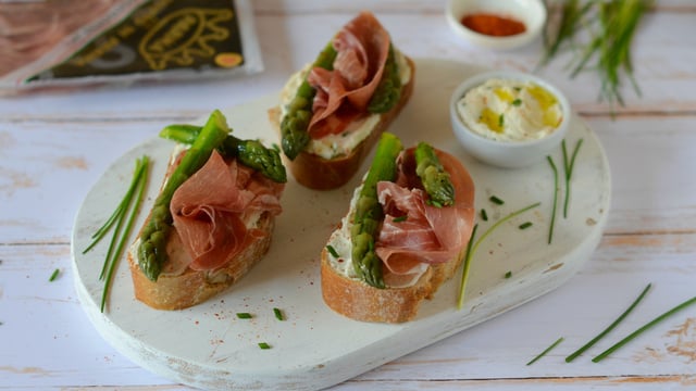 Pour un brunch, un pique-nique ou tout simplement en entrée, ces bruschettas aux asperges vertes et au jambon de Parme sont juste une merveille.