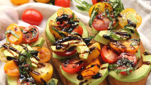 Pendant ce temps, couper les tomates cerise en quartiers. Ciseler le basilic, éplucher et couper l’avocat en tranches très fines, et les ajouter sur les tartines de pain.