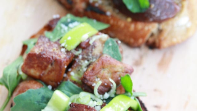 Une bruschetta fondante et craquante où les dès de foie gras du Gers se laissent confondre avec les cèpes rôtis - le tout relevé par l'ail de Lomagne et la roquette fraîche et poivrée.