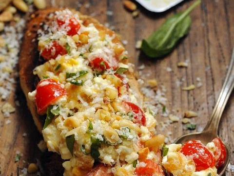Hachez les pignons et mélangez-les avec le parmesan et le basilic restant. Terminez saupoudrant ce mélange sur les bruschettas, en poivrant et en versant par dessus un tout petit filet d'huile d'olive.