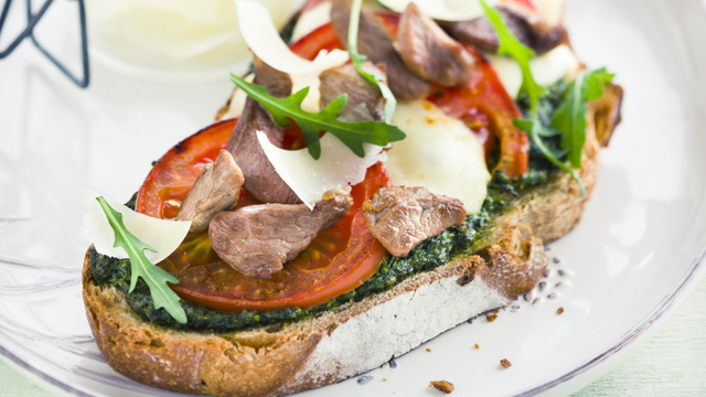 Servir les bruschettas bien chaudes, entières, coupées en tranches ou en bouchées.