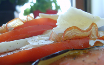 Lorsque la bruschetta a légèrement brunie, placez les tomates, les aubergines bien confites, la mozzarella et la pancetta chaude grillée (qui fera fondre la mozza), et ainsi de suite..placez les copeaux de parmesan sur le dessus, un filet d'huile d'olive, et poivrez...mamamia!