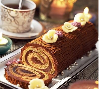 Préparer le glaçage, réchauffer le reste de ganache à feu très doux pour l'assouplir, en fouettant, puis l'étaler sur la bûche à l'aide d'une spatule métallique souple. Laisser refroidir. Avant de servir, saupoudrer la bûche de cacao à travers une passoire fine et dessiner des stries dans la longueur à l'aide d'une fourchette. Terminer le décor avec des fleurs en sucre et en pâte d'amandes (former les pétales dans la pâte d'amandes et mettre une perle argentée au milieu).