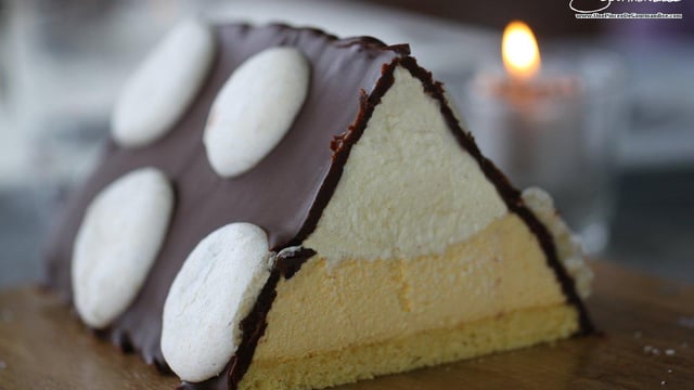 Une fine couche de génoise, surmontée d'une mousse aux fruits de la passion et d'une mousse au chocolat blanc, le tout recouvert d'un glaçage au chocolat noir... Les parfums se marient très bien, le chocolat blanc adoucit l'acidité des fruits de la passion. Le glaçage au chocolat noir croque sous la dent alors que les mousses fondent en bouche. Le tout donne un dessert très léger et festif.