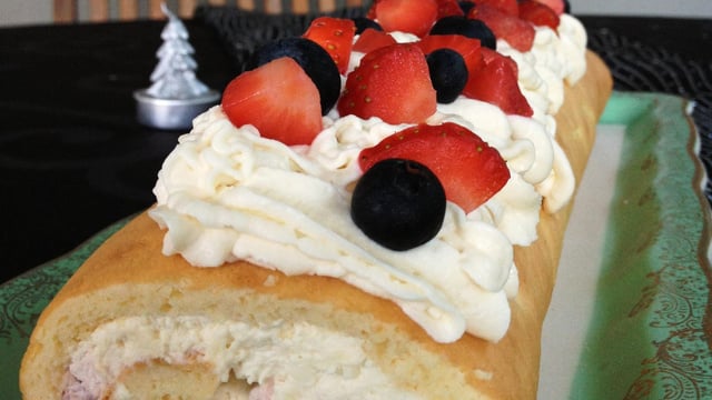 Enroule le gâteau dans un film étirable et conserve le au frais. Au moment de servir, coupe les deux extrémités du gâteau pour que ce soit plus esthétique. A l'aide d'une poche à douille, verse la crème au mascarpone tout le long du gâteau. Dispose joliment les fruits rouges sur la crème. Pour finir, tu peux éventuellement saupoudrer de sucre glace.