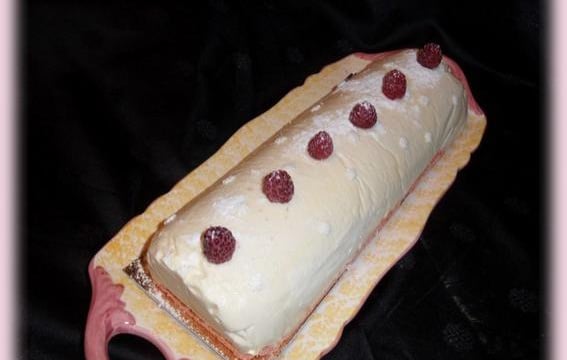 Faire ramollir les feuilles de gélatine dans de l'eau froide. Dans un saladier, blanchir les jaunes d'oeufs avec le sucre. Dans une casserole, chauffer 20 cl de crème et la verser sur le mélange oeufs-sucre tout en remuant. Remettre le tout sur feu doux et faire épaissir en remuant sans cesse, jusqu'à ce que la préparation nappe la cuillère. Hors du feu, ajouter le chocolat râpé et la gélatine et bien mélanger. Laisser refroidir en mélangeant régulièrement. Monter le reste de la crème en chantilly. L'incorporer au mélange précédent délicatement. Déposer la moitié de cette préparation dans une gouttière à bûche chemisé de papier sulfurisé, puis déposer l'insert framboise, appuyé un peu pour que la mousse chocolat blanc remonte sur les côtés et recouvrir du reste de la crème. Placer au congélateur 30 minutes. - 3