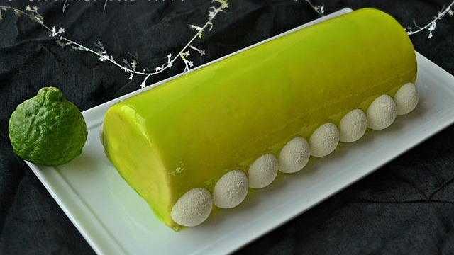 C'est une mousse au Combava, avec un insert au confit de citron, posée sur une dacquoise aux amandes et des amandes croustillantes, le tout recouvert d'un glaçage vert et garni de coques de chocolat blanc.