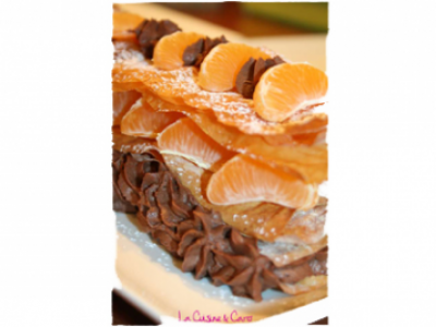 - Disposer la 3ème et dernière couche de feuilles filo. Décorer en saupoudrant un peu de sucre glace, puis avec des quartiers de clémentines contrastant avec des points de chantilly chocolat.
