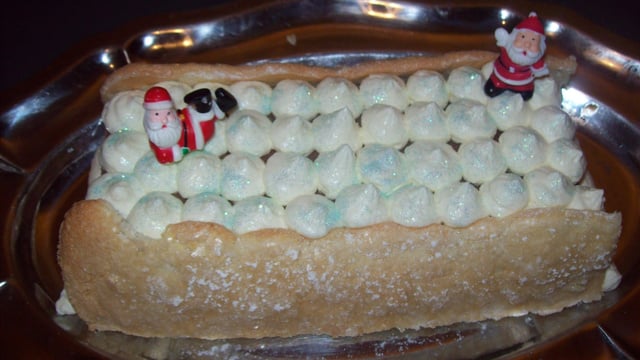 Coupez la dacquoise et la placer sur les coté de votre bûche. Sur le dessus montez une chantilly et avec une poche à douille décorez, mais ce n'est pas une obligation. Vous pouvez décorez en y mettant du chocolat en poudre ou des fruits...