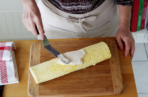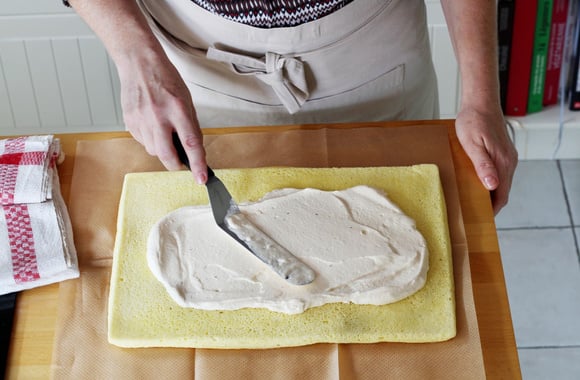 13Retirez les extrémités puis recouvrez tout le biscuit roulé avec le reste de la crème au praliné.