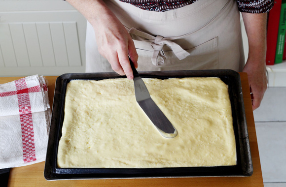 10Étalez la pâte à biscuit sur une feuille en silicone posée sur une plaque de cuisson ou une plaque à pâtisserie, en formant un rectangle d'environ 35 sur 25 cm.