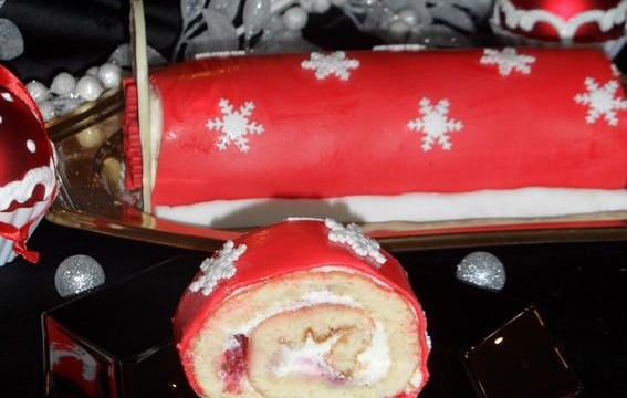 Déroulez sur du papier cuisson. Punchez avec le mélange liqueur de framboise. Garnissez avec la ganache montée au chocolat blanc et déposer les framboises sur la crème. Roulez à nouveau. Laissez prendre au frais quelques heures avant de décorer et de déguster. - 4