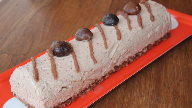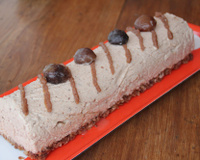 Démouler la bûche délicatement et décorer avec les marrons glacés.