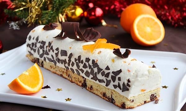 Pour changer de la traditionnelle bûche roulé, voici une bûche avec une mousse à l'orange sur une génoise aux pépites de chocolat ! Un vrai délice !
