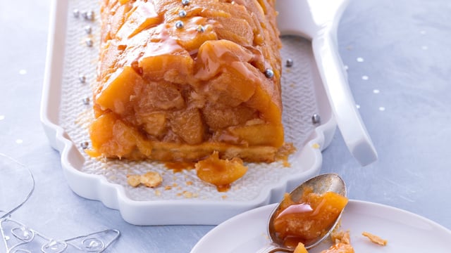 Renversez ensuite les pommes sur la pâte et accompagnez votre bûche de crème fraîche ou de glace vanille.