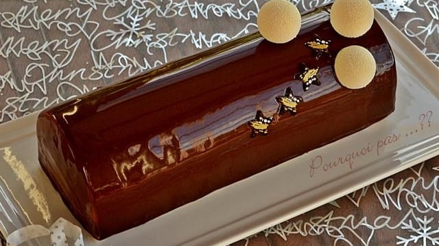 Démouler la bûche, la mettre sur une grille et faire couler le glaçage uniformément sur le tout. Garnir à votre guise puis la transférer sur le plat de service. Laisser gentiment dégeler le tout 12 heures au frigo ou 2h à température ambiante.