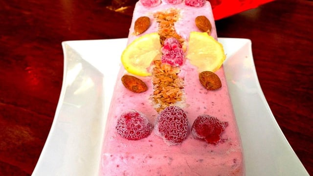 Décorer de fruits rouges, de demi rondelles fines de citron et d'amandes.... Avant de déguster !