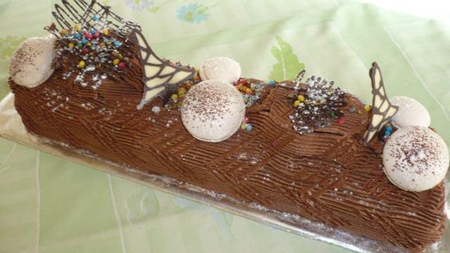 Décorer la bûche avec des champignons en meringues et des sapins bicolores des paillettes ....etc puis saupoudrer de sucre glace pour rappeler la neige.