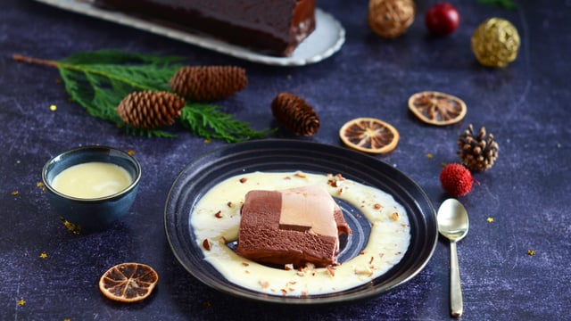 Après la pause de la crème, découpez des tranches de bûche glacée et servez-les avec la crème anglaise.