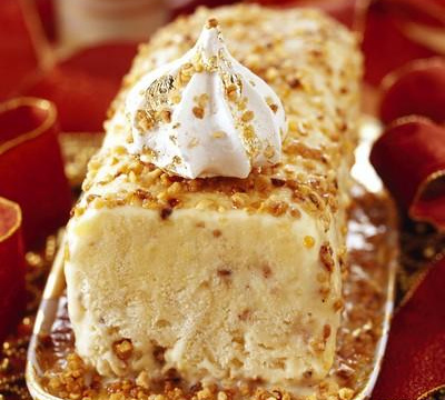 Dans un saladier, fouetter la crème liquide (qui doit être très froide) en chantilly. Lorsque elle est très ferme et forme des crêtes, l'incorporer à la préparation, en pratiquant comme pour les blancs. Incorporer alors le pralin et mélanger grossièrement sans chercher à homogénéiser (c'est simplement pour faire des sillons de pralin dans la masse). Verser la préparation dans un grand moule à cake et placer ce dernier 3 heures au moins au congélateur. Au bout de ce temps, lorsque la glace commence à prendre, la démouler sur un film alimentaire, refermer ce dernier et le rouler en bûche sur le plan de travail pour arrondir les angles. Replacer au congélateur 4 heures minimum. Sortir la bûche du congélateur 30 minutes environ avant de la servir et la placer au réfrigérateur. Au moment de la dégustation, enlever le film alimentaire recouvrant la bûche et la mettre sur un plat long. La décorer en parsemant du pralin et des mini-meringues. Servir aussitôt.