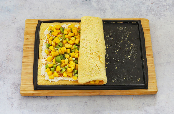 7En vous aidant du tapis en silicone ou du papier sulfurisé, roulez le biscuit, en partant de l'un des côtés les plus courts, sans trop serrer.