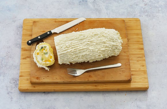 Ôtez le torchon et déposez délicatement la bûche sur une planche à découper. Etalez la crème de yaourt réservée sur toute la surface du gâteau en faisant des rainures à l'aide d'une fourchette.