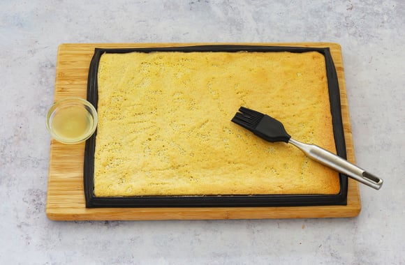 Avec un pinceau, badigeonnez généreusement le biscuit avec le sirop pour bien l'imbiber. Si besoin, parez les bords irréguliers à l'aide d'un couteau, afin d'obtenir un rectangle de pâte régulier.