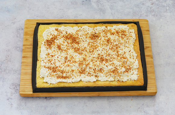 5Etalez les 2/3 de crème de yaourt sur le biscuit en une couche régulière, à l'aide d'une spatule. Saupoudrez de pralin.