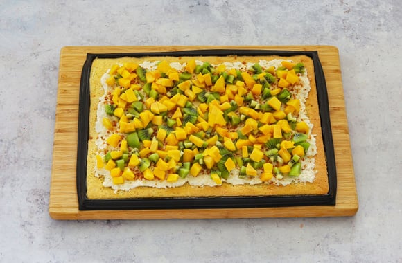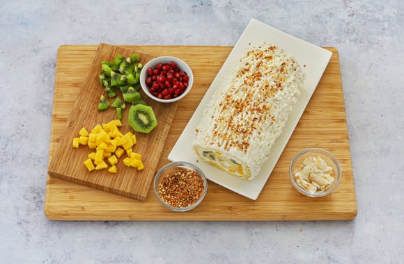 10Transférez la bûche sur l'assiette de service, décorez-la avec du pralin, des morceaux de kiwi et de mangue, quelques graines de grenade et des pétales de noix de coco.