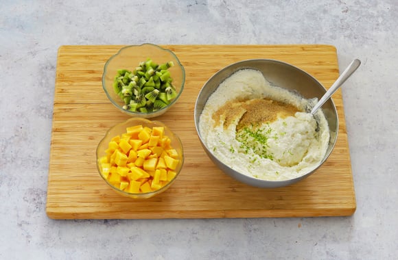 Epluchez les kiwi et la mangue, coupez-les en petits dés. Réservez dans deux bols différents.