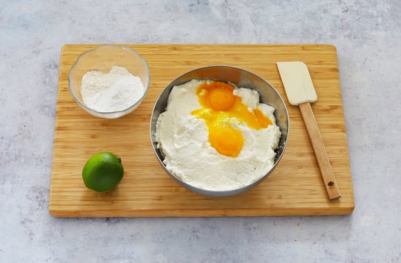Ajoutez les jaunes d'oeufs, la farine, la fécule et le zeste de citron vert râpé. A l'aide d'une maryse, mélangez délicatement pour ne pas faire "tomber" l'appareil. Vous devez obtenir une pâte mousseuse et aérienne.