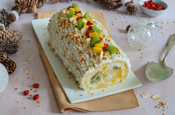 Vous adorez les traditions, mais vous rêvez de terminer le repas de Noël sur une note de légèreté ? Cette bûche de Noël légère est faite pour vous ! Elle est super légère, comme un nuage : il n’y a pas de beurre ni de garniture trop riche. La crème est faite juste avec du yaourt grec mélangé avec de la noix de coco râpé, un peu de sucre de canne, du sucre vanillé et du zeste de citron vert pour la parfumer. Pour la garniture, nous avons choisi de la mangue, du kiwi et de la grenade, pour avoir beaucoup de fraîcheur, du goût et plein de couleur ! Si vous le souhaitez, vous pouvez aussi vous amuser à décliner cette bûche avec d’autres fruits, comme par exemple des fruits rouges, des agrumes, des poires ou des pommes caramélisées. C'est une bûche gourmande et facile à préparer, idéale pour les repas de Noël et le réveillon de fin d'année. Vous pouvez aussi préparer cette bûche à l'avance et la congeler. Dans ce cas, ne mettez pas de fruits sur le dessus : vous ferez cette décoration finale le jour J, une fois la bûche décongelée.