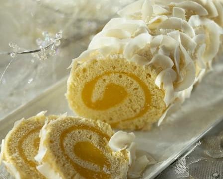 Déroulez le biscuit (ôtez le linge). Imbibez-le de sirop. Recouvrez de crème à la mangue. Enroulez le biscuit sur lui-même et enveloppez-le dans un film alimentaire. Laissez reposer au frais 6 h.