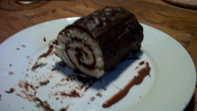 Démouler la génoise . Napper la génoise avec la moitié du chocolat puis enrouler la génoise en serrant pour que la bûche soit bien roulée .