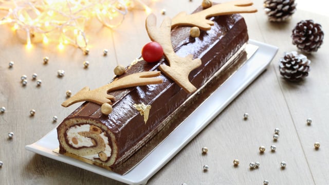 Étaler sur le biscuit une fine couche de Nutella®. Garnir le biscuit de la crème chantilly. Parsemer de noisettes grillées. Rouler votre biscuit en forme de bûche. Réaliser avec une poche à douille le décor de la bûche avec du Nutella®. Décorer avec les bois en pâte sucrée et une petite boule de pâte d’amande pour le nez. Réserver au réfrigérateur.