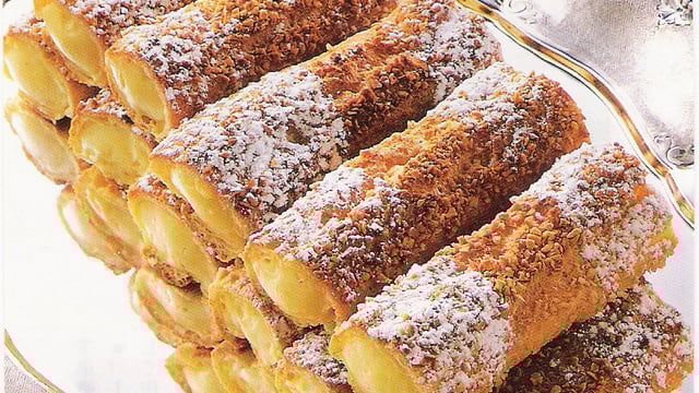 - 3Finition :Couper les extrémités des bandes - les diviser en trois parties égales - passer à l'intérieur de chaque pièce - le dos d'un crayon - garnir de crème par les deux bouts en allant jusqu'au centre - une fois garnies - lisser chaque extrémité avec une palette. - saupoudrer de sucre glace.