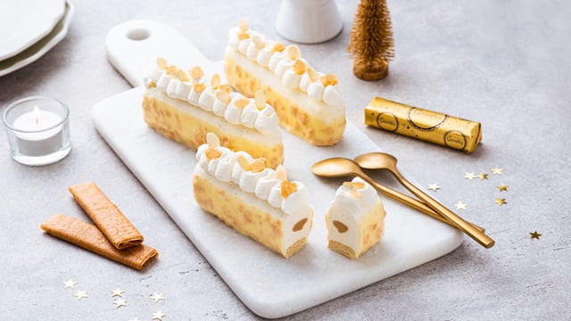 Des bûchettes à la vanille, caramel et chocolat blanc, agrémentées par des Crêpes dentelles Gavottes. Un régal pour les Fêtes !