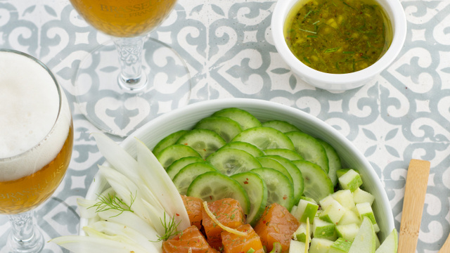 Émincer le fenouil, le mélanger avec un peu de jus de citron. Laver et couper la pomme en cubes, ajouter du jus de citron, mélanger et réserver. Couper le demi concombre en fines tranches. Sortir le saumon du congélateur et couper les pavés de saumon en cubes.