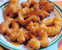 Faites une fente au centre de ces rectangles et passez y une des deux extrémités. Faites chauffer l'huile de friture, puis plongez un petit nombre de bugnes. Lorsqu'elles sont bien dorées, égouttez les, saupoudrez les de sucre glace, puis procédez de même pour les autres séries. Servez les bugnes chaudes, tièdes ou froides, et personnellement je les préfère le lendemain.